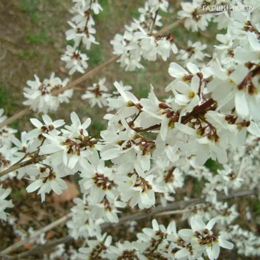 Абелиолистник (Форзиция белая) - известная своим изящным внешним видом и стойкостью к неблагоприятным условиям, является отличным выбором для декоративного оформления сада. Это многолетнее растение, принадлежащее к кустарниковой жизненной форме, отличается умеренным темпом роста, достигая высоты до 2 метров. Его побеги прямостоячие и густо разветвленные, что придает кусту пышность и объем. Листья абелиолистника имеют характерную овальную форму и насыщенный зеленый цвет, который сохраняется на протяжении всего сезона.