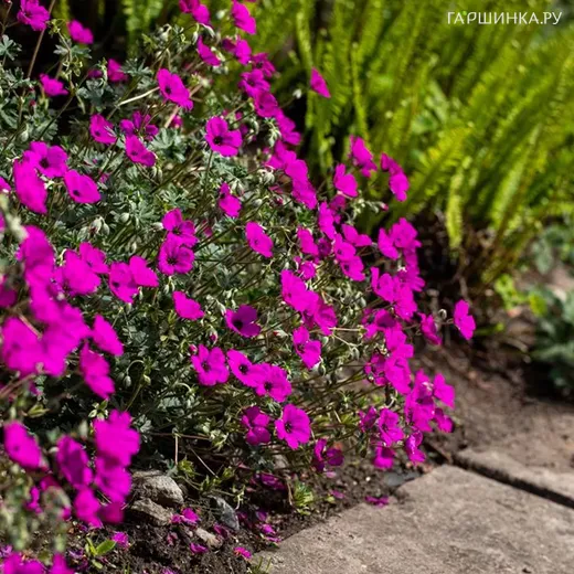 Герань садовая Гюссепии – эффектный почвопокровный неприхотливый многолетник. Высота 15 см. Цветки диаметром 3,5 см. Цветки тёмно- пурпурные с чётко выразительным тёмным глазком и прожилками. Миниатюрные кустики с седовато- зелёными, сильно рассечёнными, красивыми листьями. Период цветения июнь- июль.