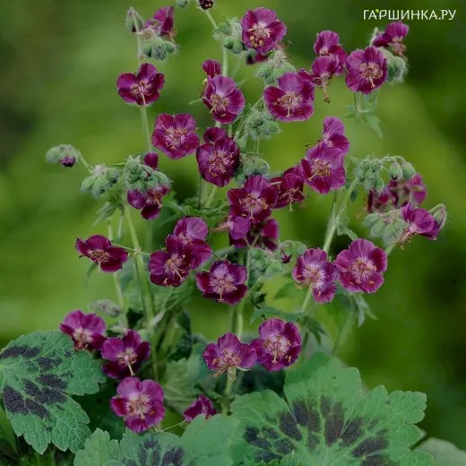 Герань темная Самобор имеет компактную форму роста, достигая высоты до 40-60 см. Ее побеги густо покрыты листьями, которые обладают уникальной темно-зеленой окраской с характерными пурпурными пятнами, что придает растению особую декоративность. Листья имеют округлую форму и зубчатые края, создавая плотную крону. Цветы герани темной Самобор мелкие, но многочисленные, с яркими фиолетовыми лепестками, собранными в соцветия. Период цветения длится с мая по июль, что позволяет наслаждаться красотой растения на протяжении всего лета.