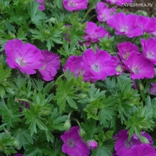Герань садовая Макс Фрай – эффектный почвопокровный неприхотливый многолетник. Высота 30 см. Листья не опадают на зиму, светло- зеленого цвета, осенью часть листьев приобретает ярко-красную окраску. Цветки многочисленные, пурпурно- красные, обильно осыпают весь куст. Цветение очень обильное и продолжительное, с середины июня до августа.