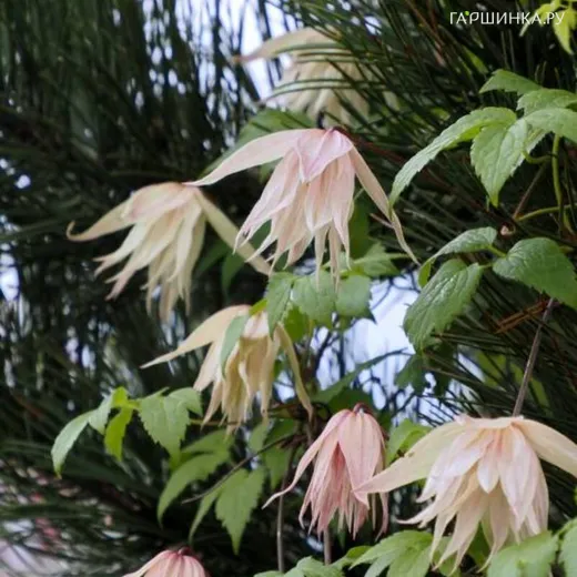 Клематис (Княжик) Пинк Свинг (Розовые качели) махровый крупноцветковый (1) - Цветки махровые, колокольчикообразные, свешивающиеся, слегка пахнущие грейпфрутом, сидящие на пурпурных цветоножках. Цветки складываются из эллипсообразных, вытянутых, остро заканчивающихся со слегка волнистыми краями чашелистиков, на внешней стороне кремово-розовые, снизу светло-розовые, иногда почти кремового цвета. Цветет в мае и повторяет цветение, но уже менее обильно – летом. Имеет красивые темно-зеленые относительно крупные (до 23 см длиной и 19 см шириной) листья – тройные, тройчатосложенные, с красивой фактурой и зубчатыми краями листочками.