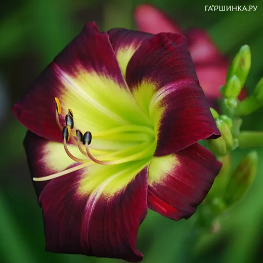 Лилейник Найт Бекон– травянистый корневищный многолетник. Высота растения - 70 см; диаметр цветка - 10 см. Бархатный темно- пурпурный цветок с очень крупным ярким желто-зеленым горлом. Вечнозеленый диплоид. Цветение повторное. Среднеранний срок цветения (конец июля).