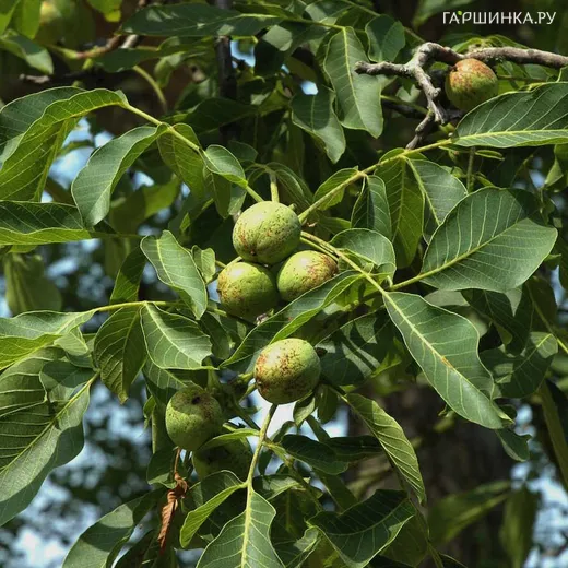 Орех грецкий - дерево достигает 30-35 м высоты, ствол от 1 до 1,5 м в диаметре. Дерево со сравнительно небольшой кроной, одиночно растущие деревья с широкой, шатровидной. Кора у молодых деревьев блестящая, оливково-серая, позже — глубоко- продольно- трещиноватая. Листья непарноперистые, до 40(75) см длиной, из 5-11 листочков, величина которых уменьшается от вершины листа к основанию. При растирании листьев ощущается приятный запах. Мужские цветки в сережках у основания листьев на побегах прошлого года, женские — на верхушке молодых побегов. Плод — костянка с мясистой зеленой оболочкой, подсыхающей и чернеющей на дереве. Оболочка при созревании растрескивается еще на дереве. Семя заключено в костяную, морщинистую оболочку из двух створок, соединенных выступающим ребром.