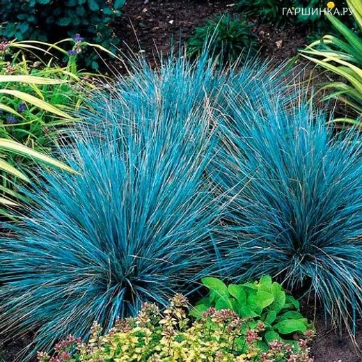 Овсяница сизая - Пользуется наибольшей популярностью из всех представителей семейства. Достигает в высоту всего 30-60 см, формирует очень пышный, густой и почти идеально сферический кустик из линейных, узких и жёстких листьев. Распускающиеся над ними серые метелки на прямых цветоносах мягкие, нежные и в целом неприметные, подчеркивают шаровидную форму куртинок.
