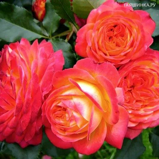 Роза Мидсаммер флорибунда, Тантау (лиц) - Бутон кремово-розовый с ярко-красными краями лепестков, округлый, крупный. Цветок оранжево-красно-желтый с золотисто-кремовой обратной стороной лепестков, чашевидный до шаровидного, с высоким центром, махровый (30-40 лепестков), обладает легким ароматом, долго сохраняет форму. Цветки собраны в небольшие соцветия. Лист зеленый, крупный, глянцевый. Диаметр цветков: 5-7 см. Цветение очень обильное, непрерывное с июня по октябрь. Растение компактное, устойчивость к заболеваниям высокая, морозостойкий сорт, хорошо переносит жаркое лето.