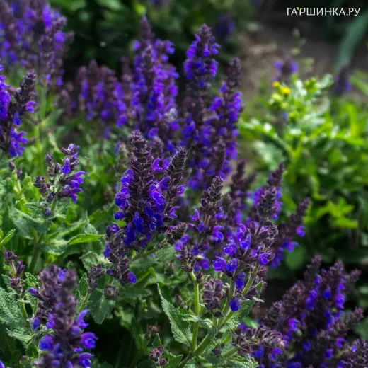Шалфей (сальвия) дубравный Негрито - высота во время цветения около 60 см. Цветет в июле-августе. Цветки ярко-фиолетовые, собраны в колосовидное соцветие. На верхушках соцветий бутоны вишневые, что придает этому сорту дополнительную декоративность. Светолюбив. Почвы рыхлые, достаточно сухие, не переносит тяжелых глинистых и переувлажненных почв. Для продления цветения центральное соцветие удаляют, для стимуляции роста боковых побегов. Зимостоек.