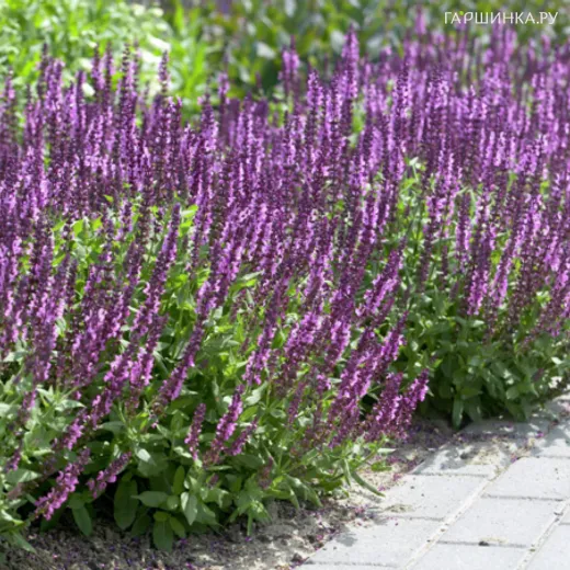 Шалфей (Сальвия дубравная) Аметист яркий представитель рода Шалфей. Это растение средней величины имеет многочисленные побеги, которые оканчиваются разветвленными соцветиями. Цветы крупные, окрашены в сиренево-розовый цвет, распускаются в июле-августе. Если своевременно удалить отцветшиеся соцветия, то это провоцирует на повторное цветение растения. Высота куста 60 см.