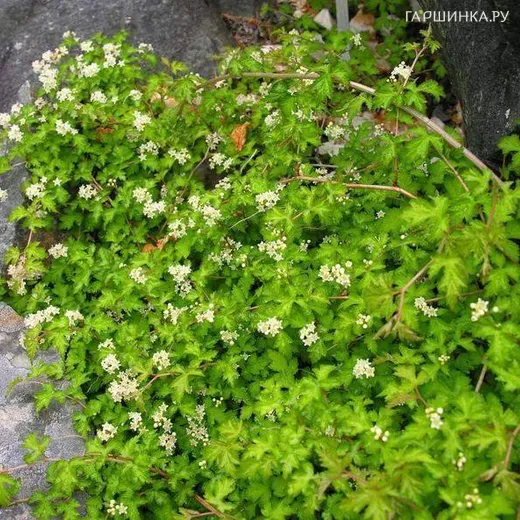 Стефанандра Криспа - Хотя небольшие соцветия довольно привлекательны, изящество кроны обусловлено прежде всего декоративной листвой. Эффект воздушности и сквозистости куста достигается за счет особой формы и расположения листьев. Глубоко изрезанные листовые пластинки с острыми зубчиками по краю и пильчатыми прилистниками расположены в разных плоскостях. Летом нежно-зеленые листья контрастируют с яркими блестящими красноватыми побегами. Но особенно привлекателен кустарник осенью, когда листья окрашиваются в лимонные, розовые и даже красные цвета. Crispa (Криспа) - карликовая форма с гнездовидной формой кроны, до 0,5 м высотой и 1,5 м шириной, с трёхлопастными остропильчатыми листьями.Этот сорт является одним из наиболее изящных почвопокровных декоративнолиственных кустарников для средней полосы России. Тонкие побеги «Криспы», чуть приподнявшись над почвой, возвращаются обратно, и, многократно укореняясь, образует подобие дернины. Общий облик куста выражено подушковидный с плавным ниспаданием к периферии. Среднезимостоек, в суровые зимы может обмерзать, но хорошо восстанавливается.
