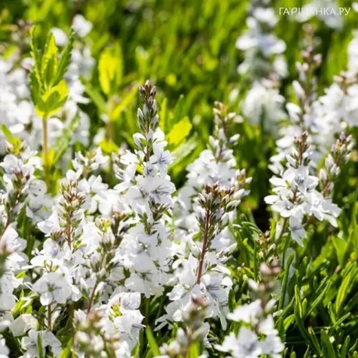 Вероника простертая Альба - Серовато-зеленое многолетнее травянистое растение, образующее плотный ковер до 10 см высоты со стержневым корнем. Стебли многочисленные, бесплодные - лежачие, цветущие - восходящие. Листья 1-2 см длины. Растение сохраняется зеленым зимой. Растет на любой рыхлой садовой почве. Солнцелюбива, но теневынослива. Размножают семенами или вегетативно - черенками. Подходит для создания куртин, посадки на подпорных стенках и террасах каменистых садов, для декорирования миксбордера.