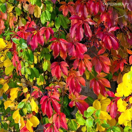 Девичий виноград - многолетняя, декоративная листопадная лиана. Рост быстрый, плети 15м, направляется легко, куст обильнолиственный. Лист яркий, широкий, форма сложная, весной - зеленый, осенью окраска разнообразна желто-красно-оранжево- бордово-коричневая с перламутровым оттенком. Зона зимостойкости 4.