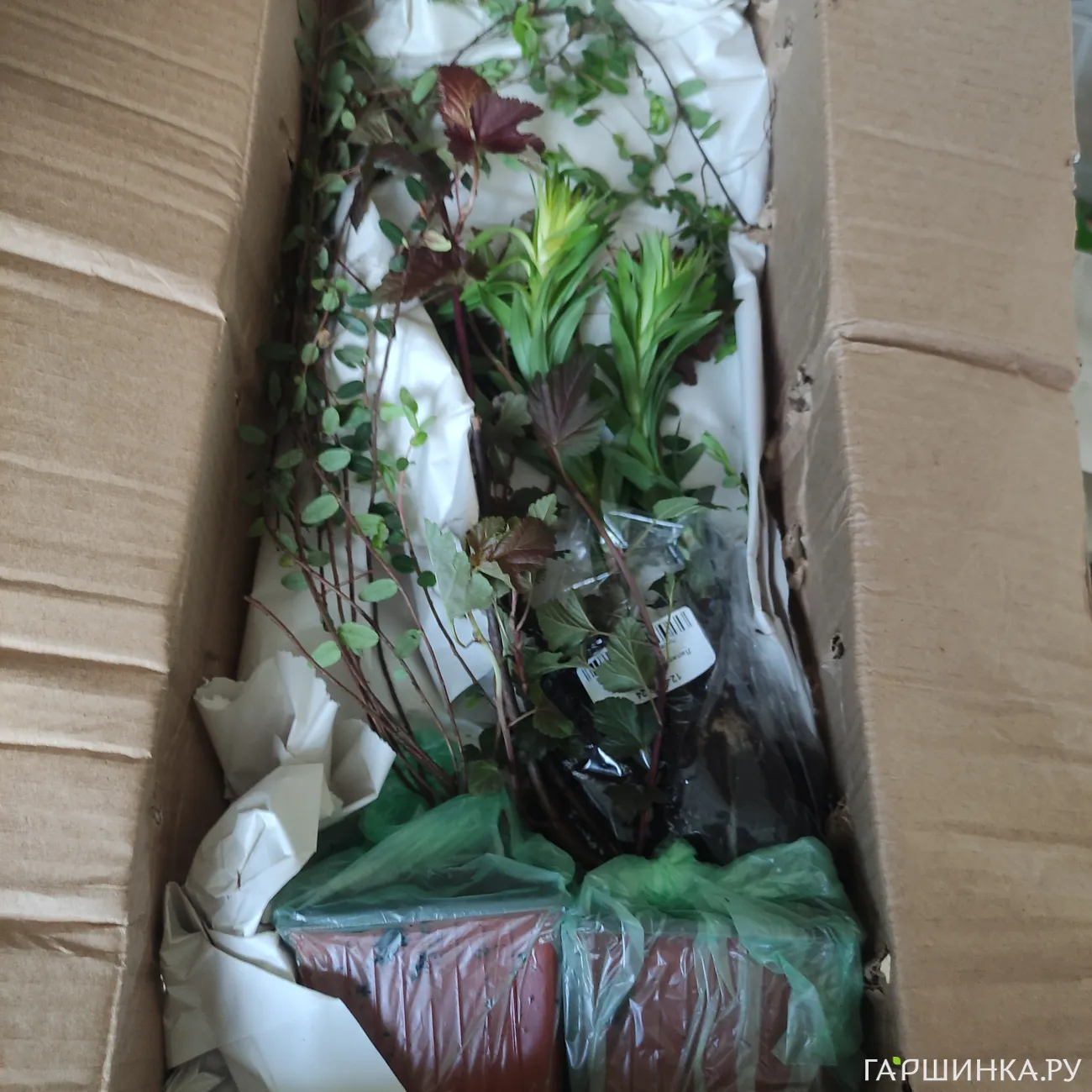 Добрый день! Посылка пришла раньше времени . Растения все в хорошем состоянии , все живые с листочками, земля мокрая в горшках. Я очень довольна. Покупала барбариси Венис', рододендрон гибридный, сирень Чарльз Джоли, пузыреплодники: ред Барон, Диаб